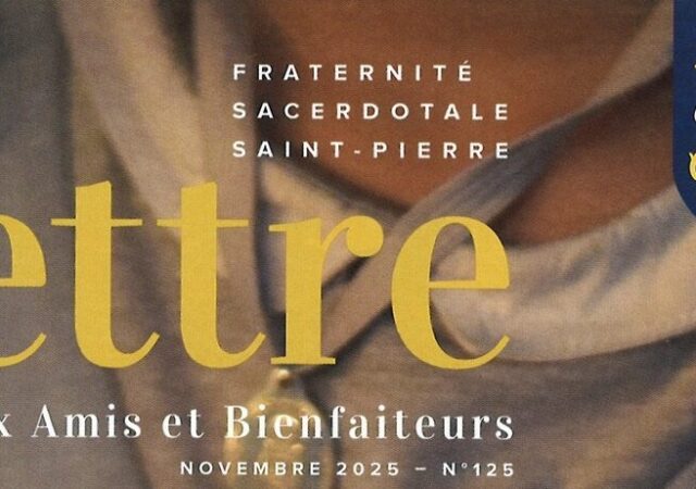La dernière Lettre aux Amis et Bienfaiteurs de la Fraternité Saint-Pierre (Novembre 2025, n°125) revient sur les dernières activités apostoliques de ses prêtres en France : la session Lire la suite ...