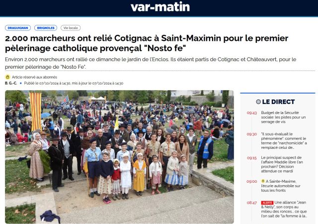Le 1er Pèlerinage Nosto Fe a eu lieu les 5 et 6 octobre de Cotignac à Saint-Maximin. Il a réuni plus de 2 000 participants accompagnés par des prêtres, séminaristes de différentes communautés Lire la suite ...