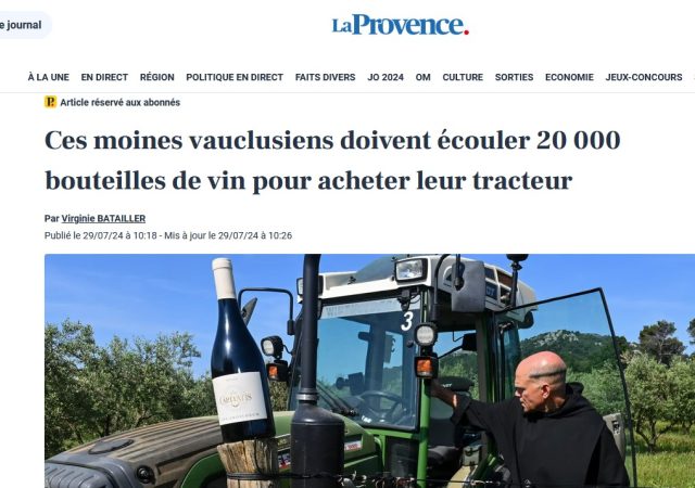 Dans son édition du 29 juillet, le journal La Provence évoque les vins produits par les moines du Barroux et leur besoin d’acheter un nouveau tracteur.