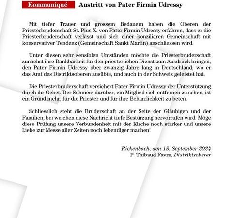 Un lecteur du Forum Catholique publie le communiqué (pondéré) de la Fraternité Saint-Pie X (District d’Allemagne) concernant le départ de l’abbé Firmin Udressy, Lire la suite ...