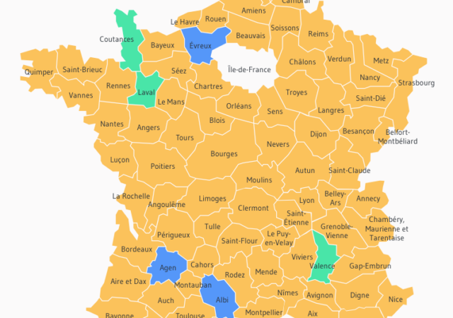 La CEF a publié la carte interactive des sièges épiscopaux vacants. 4 sièges sont encore vacants : Valence, Pamiers, Laval et Coutances.