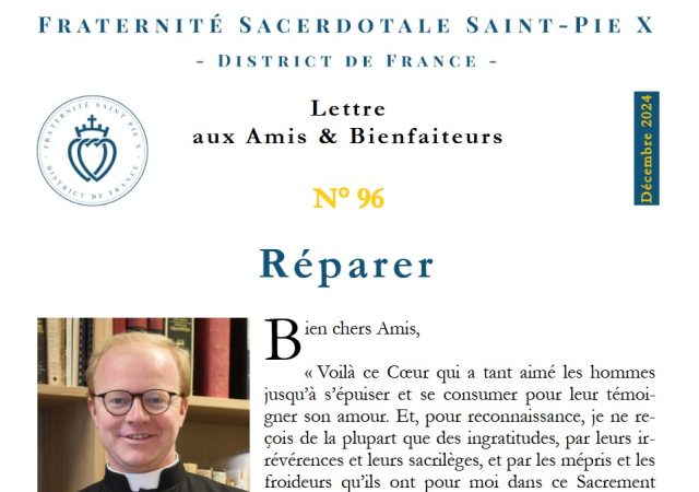 Dans son éditorial de la lettre aux Amis et Bienfaiteurs de la Fraternité Saint-Pie X (n°96, décembre 2024), l’abbé Gonzague Peignot, Supérieur du District de France de la Lire la suite ...