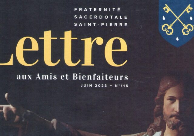La dernière lettre aux Amis et Bienfaiteurs de la Fraternité Saint-Pierre (n°115, Juin 2023) évoque notamment l’intronisation au Sacré-Coeur dans les foyers.