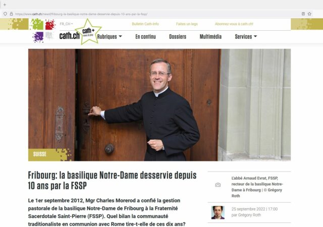 Le portail catholique Cath.ch évoque le 10ème anniversaire de la nomination de la Fraternité Saint-Pierre à la tête de la Basilique Notre-Dame de Fribourg (Suisse) :