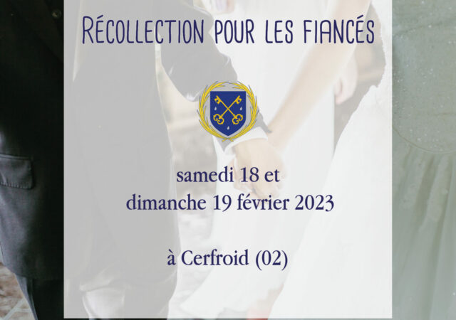 L’Oeuvre des Retraites de la Fraternité Saint-Pierre propose une récollection pour fiancés les 18 et 19 février à Cerfroid (02) :