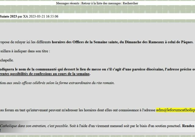 Comme chaque année, le Forum Catholique a collecté les horaires des messes et offices de la Semaine Sainte dans les paroisses diocésaines, dans celles desservies par les communauté Lire la suite ...