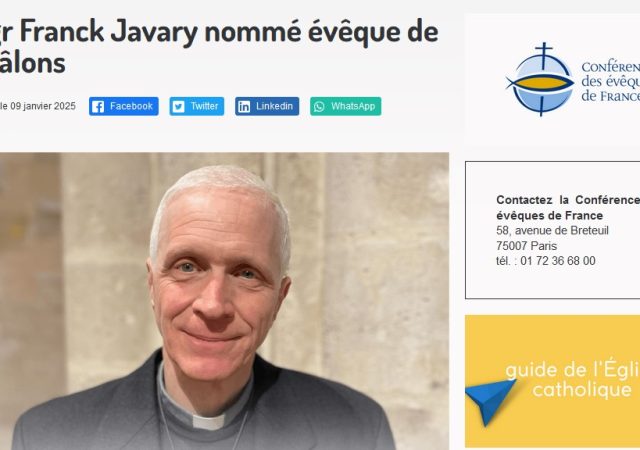 Le Pape François a nommé ce jour Mgr Franck Javary, évêque de Châlons (51). Agé de 57 ans, Mgr Javary est prêtre du diocèse de Nanterre et il succède à Mgr Touvet, nommé coadjuteur à Fréjus-Toulon Lire la suite ...