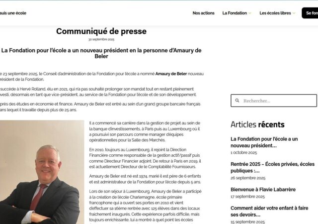La Fondation pour l’Ecole annonce qu’elle vient de désigner son nouveau président : Amaury de Beler. Il succède à Hervé Rolland qui n’a pas souhaité prolonger Lire la suite ...