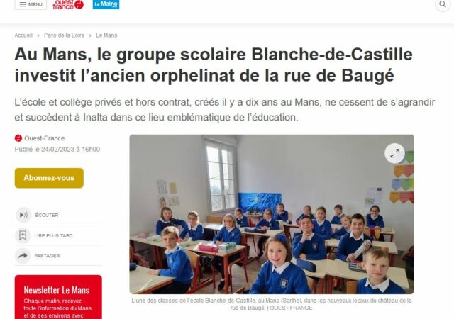 Fondé il y a 10 ans par un groupe de parents, l’école et le collège Blanche de Castille (Le Mans) ont quitté leurs locaux du centre ville pour les locaux de l’ancien orphelinat Lire la suite ...