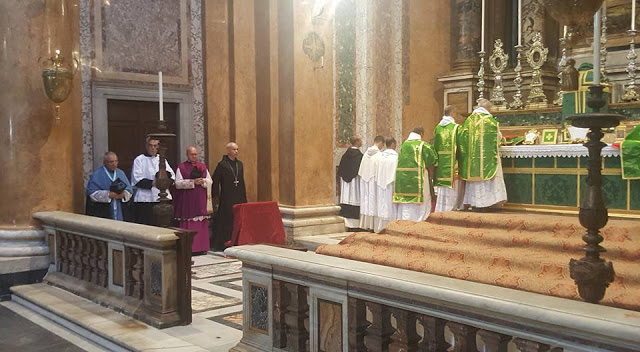 Dimanche pour le dernier jour du Pèlerinage Summorum Pontificum, la messe était célébrée à l’église de la Trinité des Pèlerins à Rome, paroisse personnelle dont la Fraternité Saint-Pierre a la charge, par le RP Dominique-Marie de Saint-Laumer, prieur de la Fraternité Saint-Vincent Ferrier. La messe était célébrée en rite dominicain.