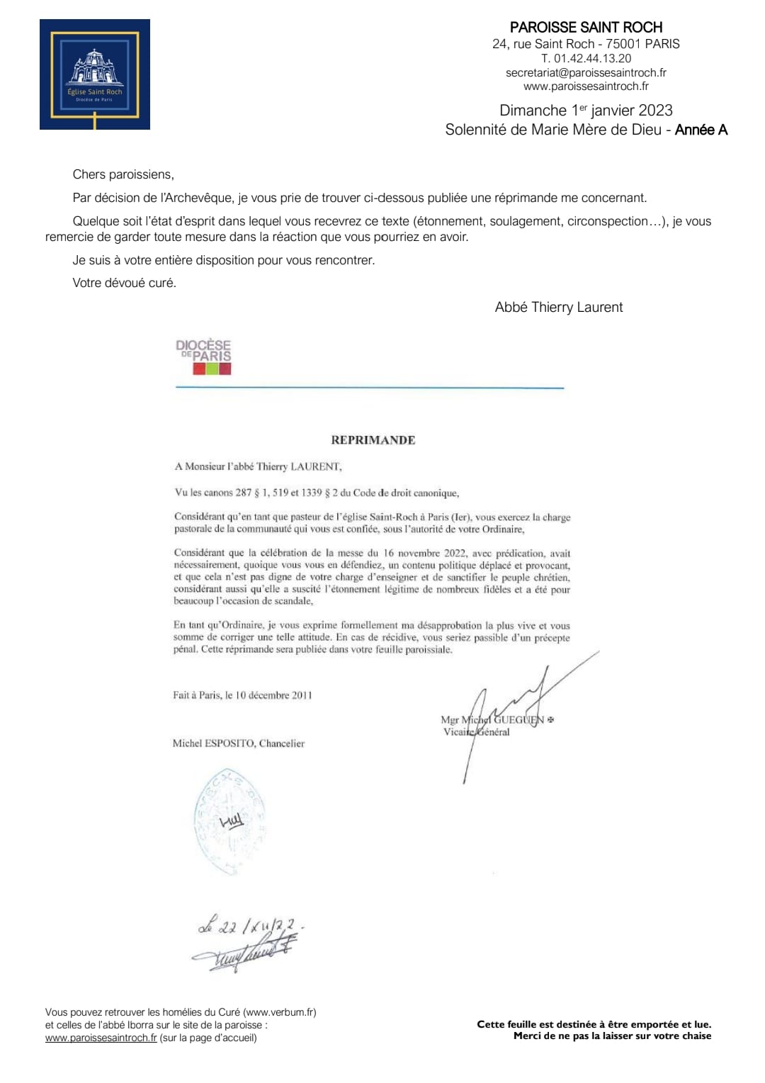 Accueil » Nos archives » Réprimande contre le curé de Saint-Roch à Paris En Une Réprimande contre le curé de Saint-Roch à Paris Il avait osé célébrer une messe pour le repos de l’âme de Charles Maurras. Cette messe avait été dénoncée par un article de Libération. Le diocèse réagit dans un courrier daté de… 2011 (est-ce valide ?) : Article précédentEmission En quête d’esprit (01/01/2023) consacrée au pape émérite Benoit XVI Article suivantSaint-Dié : le diocèse signe un protocole avec le parquet pour le signalement des abus sexuels 2 janvier 2023